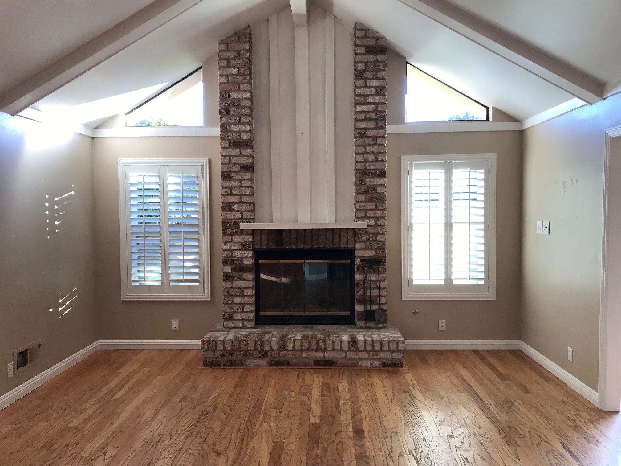 Living Room: Dramatic vaulted ceilings, cozy gas log fireplace, and oak hardwood floors.