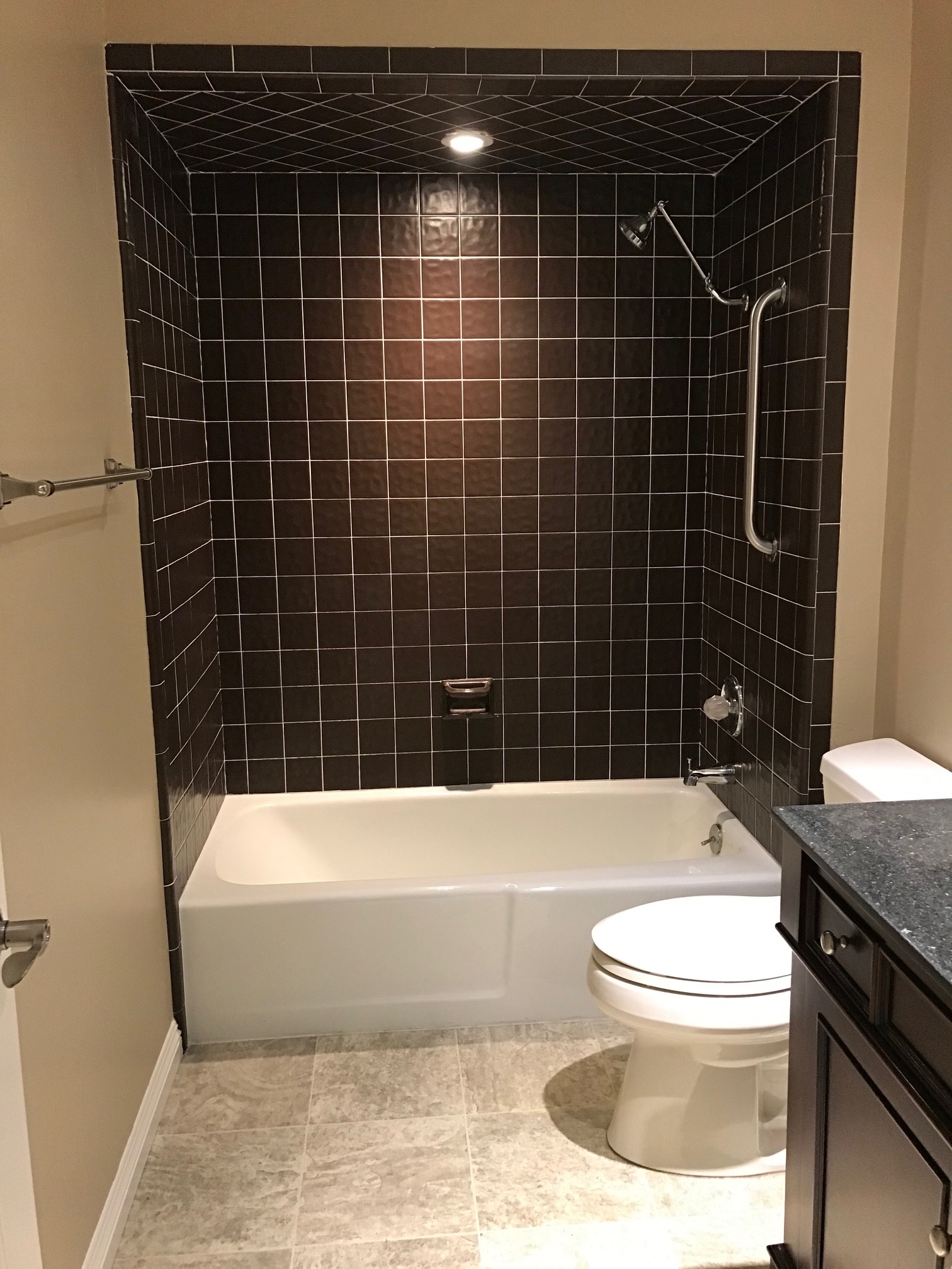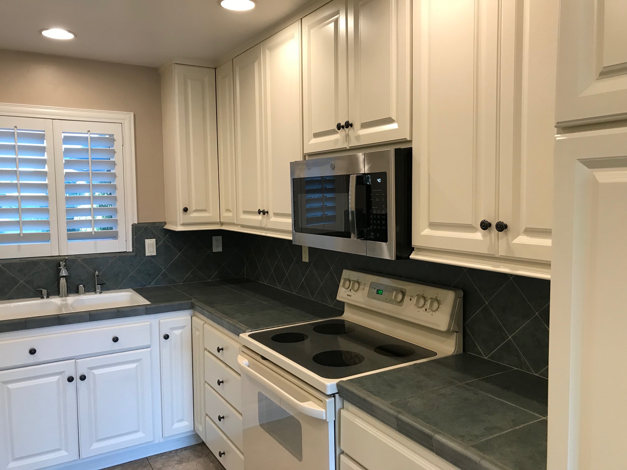 Kitchen: Modern and functional with tile counters and floors, built-in microwave with hood fan over the electric range, dishwasher, disposal, and corner revolving carousel storage. Pantry closet features convenient pullout shelves, and a Kenmore Elite refrigerator is included.