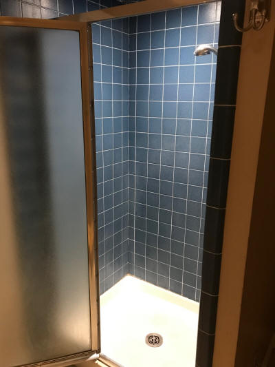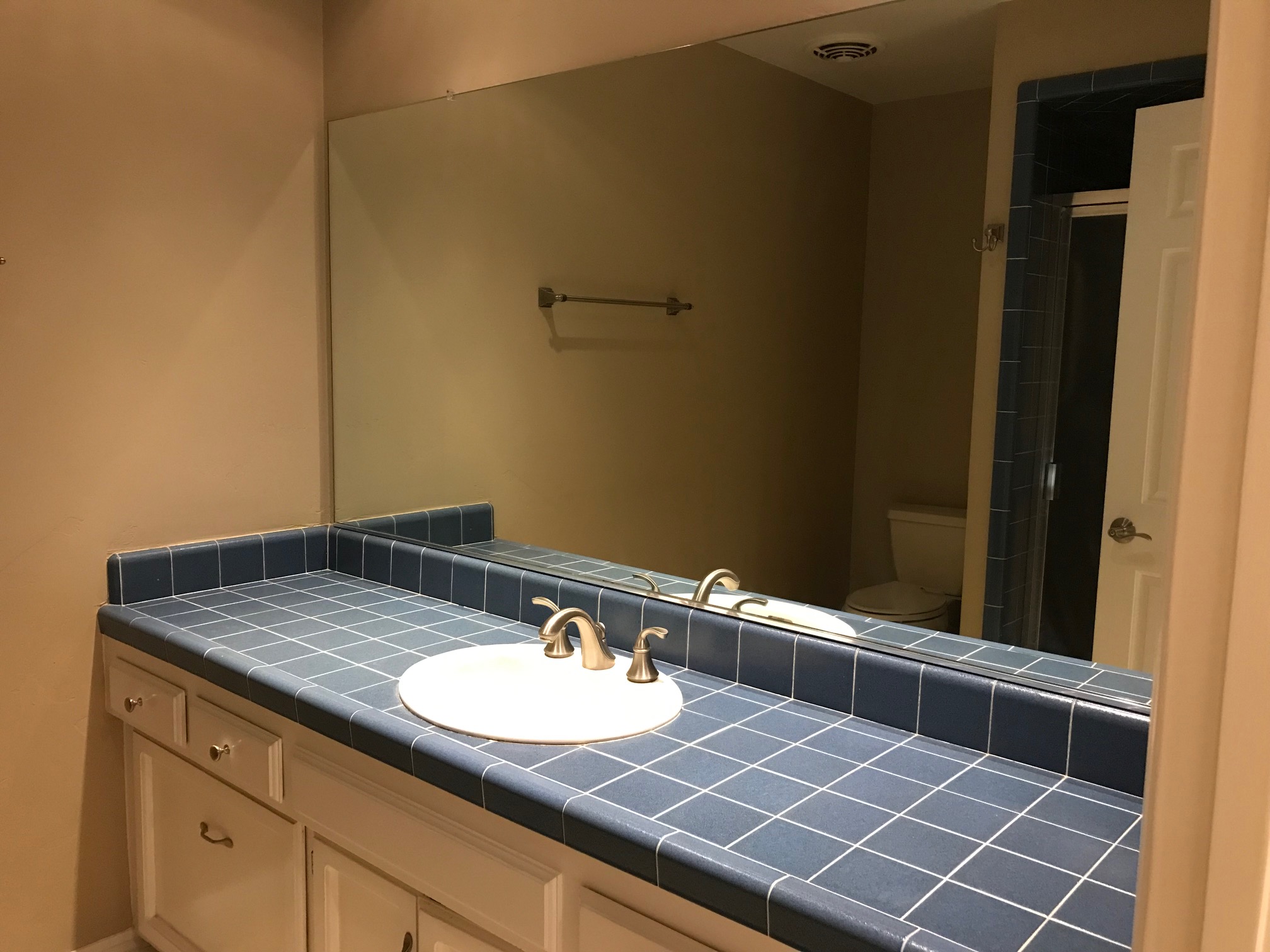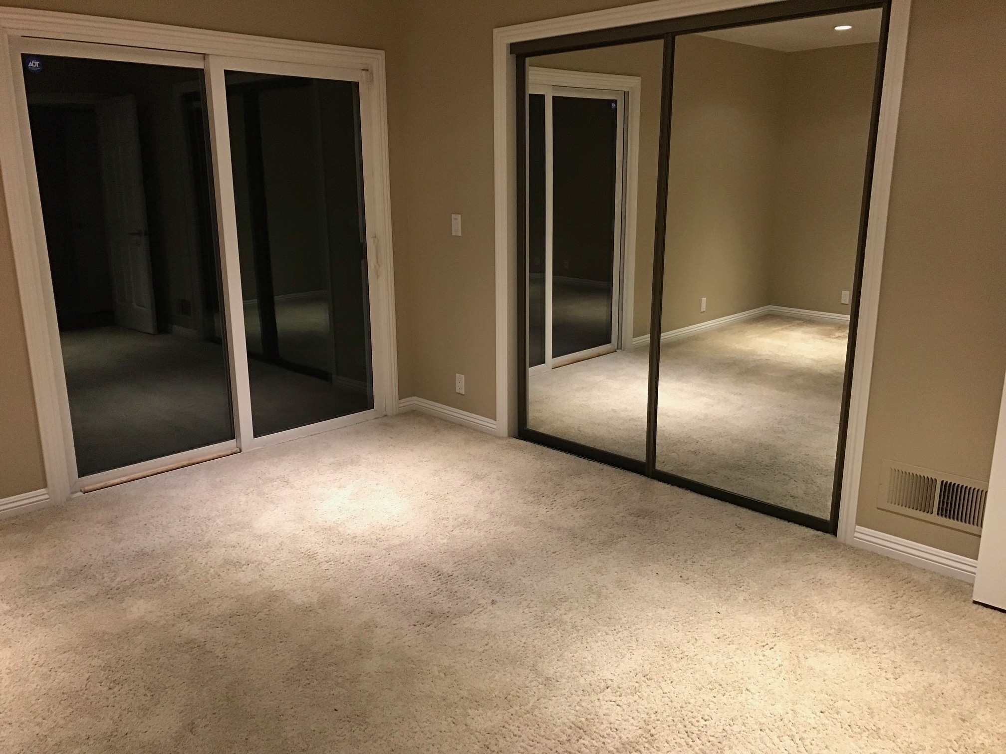Master Suite: Spacious bedroom with mirrored closet doors and slider access to a private backyard patio. The en-suite bathroom has a tile stall shower, vanity counter, and tile flooring.
